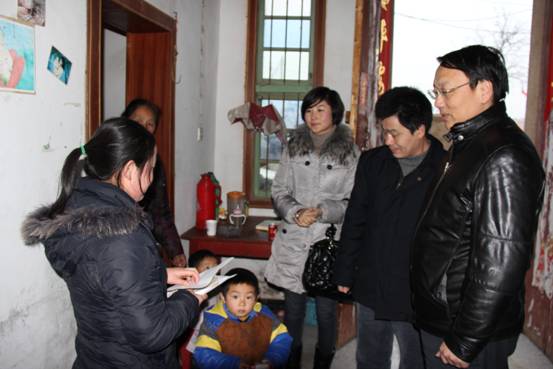 图3. 2012年2月16日,阳逻格林美总经理杨正新在塑木分管副总邓德武、行政中心总经理助理兰兰的陪同下来到涂永菊家中