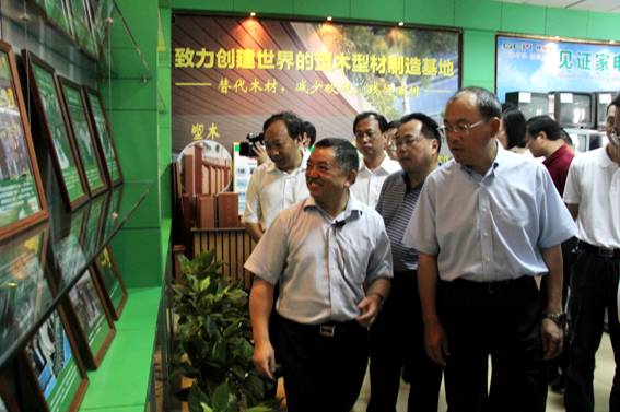 图4. 阮书记高度赞赏格林美用废塑料生产的塑木型材,表示要在全市推广