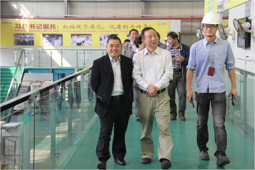 图2:许开华董事长(左一)陪同尚钢书记(中间)参观电子废弃物拆解车间