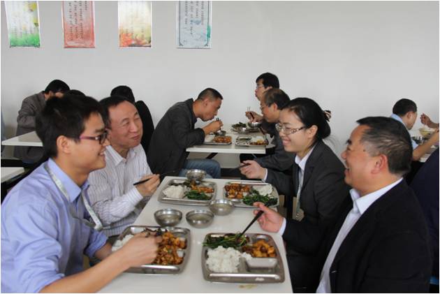 ??????? 座谈结束后,许开华董事长与尚钢书记一行在格林美员工食堂跟纺大毕业生张世庆、唐羽共进午餐,在轻松愉快的交流中结束了此次格林美参观之行。