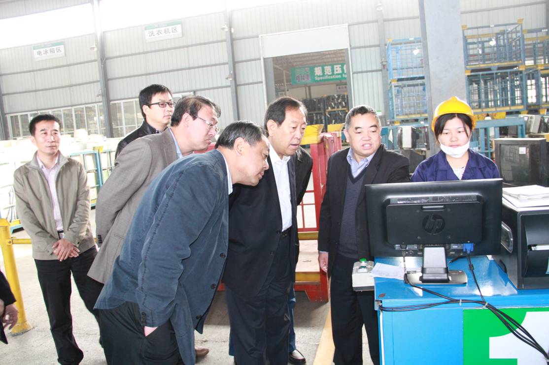 图二 许开华董事长(右二)向刘长顺主任(左三)一行介绍电子废弃物信息录入系统
