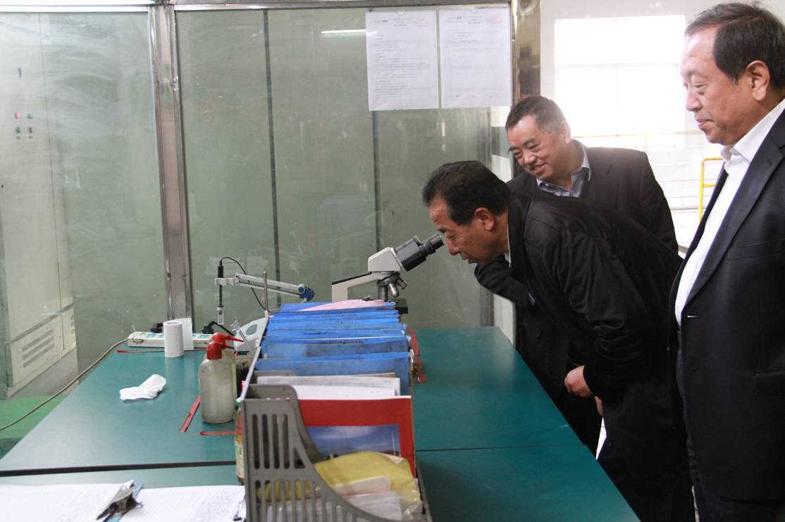 图四 许开华董事长邀请天津市静海县政协主席刘建国(中间)观察格林美制备的球形钴材料的微观形貌