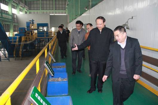 图三 许开华董事长(右一)带领王会长(右二)参观格林美电子废弃物循环利用产业园线路板绿色综合利用车间