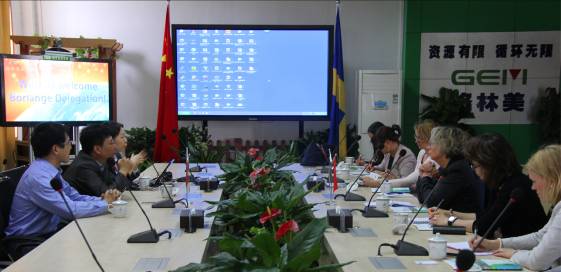在会议室,焦华总与瑞典博伦厄市代表团一行就两国废弃资源的回收与处置进行研讨,Charlotta Olsson女士就瑞典国内居民参与回收与政策发展环境进行了说明,提供了生产环境与处理工艺上的先进经验,并诚挚邀请格林美员工前往瑞典参观交流。