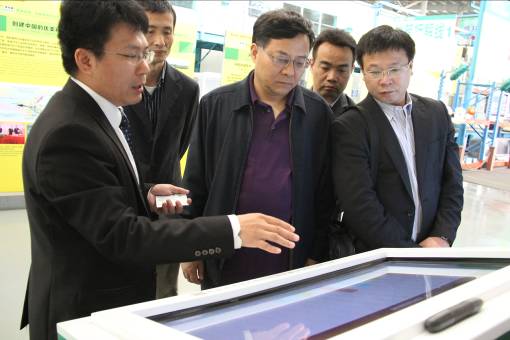 图二:焦华总(左一)向郝建董事长(中)一行介绍物联网回收信息终端