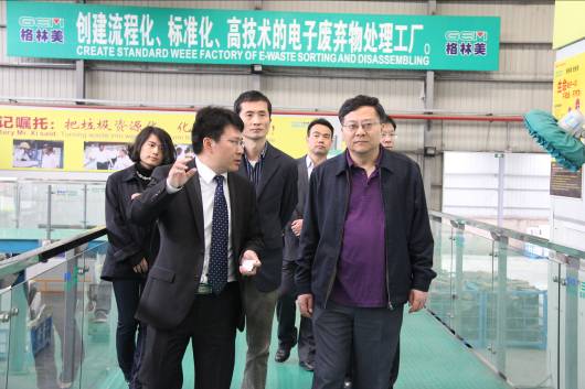 图一:焦华总(左一)向郝建董事长(左二)一行介绍格林美电子废弃物回收模式