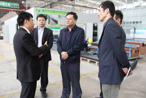 图四:焦华总(左一)向郝建董事长(中)一行介绍塑木型材的生产工艺