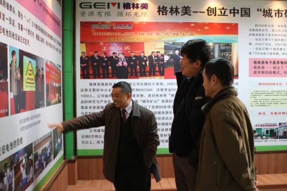 在格林美武汉分公司循环展厅,董事长许开华教授向到访领导介绍了格林美几年来在“城市矿产”开采与利用实践、不断提高资源综合利用水平所取得的成果,并展望未来,介绍了公司在发展以电子废弃物为主体的循环产业战略发展构想。