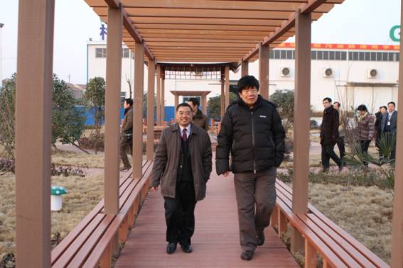 图四 李新民巡视员在许开华董事长的陪同下参观格林美采用废物再造的塑木型材园林长廊