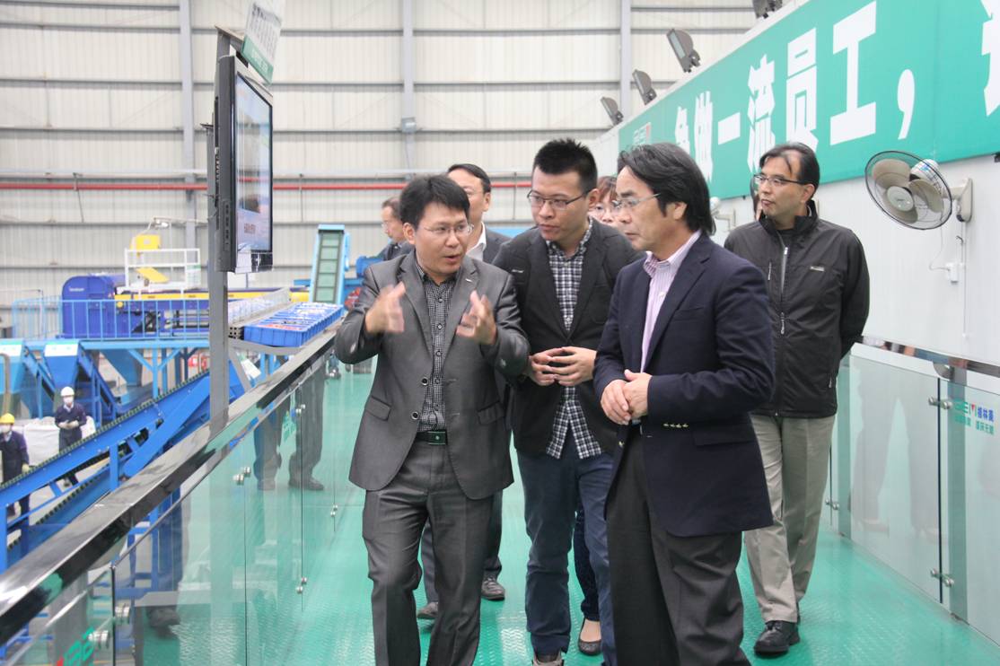 图2:公司常务副总焦华(左一)向永塚社长(左三)介绍电子废弃物拆解工艺原理?