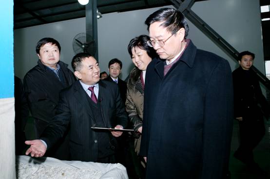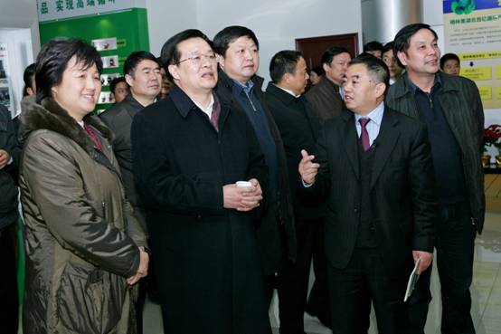 图一 湖北省委副书记、代省长王国生(左二)在省政府秘书长傅德辉(左三)、省经委主任欧阳万坤(右一)和荆门市委书记王玲(左一)等陪同下,参观格林美荆门循环产业展厅,图为王国生和董事长许开华教授亲切交谈