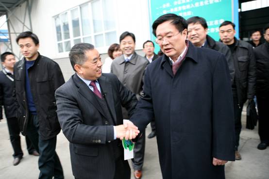 图四 王国生省长握着许董事长的手,表示省政府坚决支持格林美做大做强在湖北的循环产业