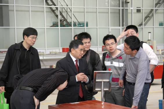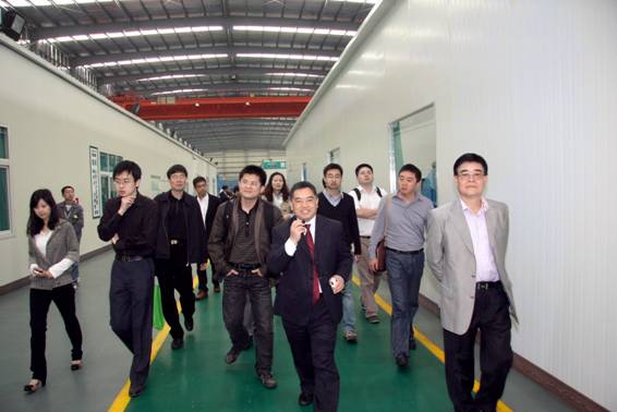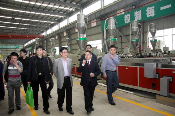 图二 格林美2010年度股东大会参会代表在董事长许开华教授陪同下参观塑木生产车间