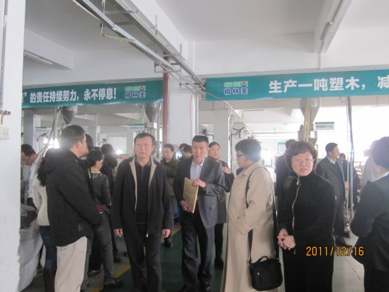 图1 国家知识产权局领导在格林美彭本超副总经理的陪同下参观塑木型材生产线