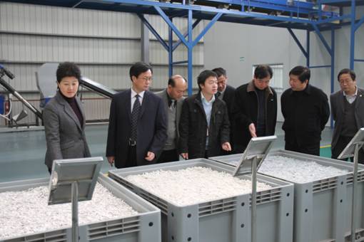 图四 许甫林主任(左二)一行对格林美的废旧塑料回收技术表示赞赏