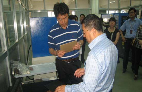 图二 国家发改委环资司牛波处长(左一)在许开华董事长(右一)的陪同下参观格林美深圳研发中心