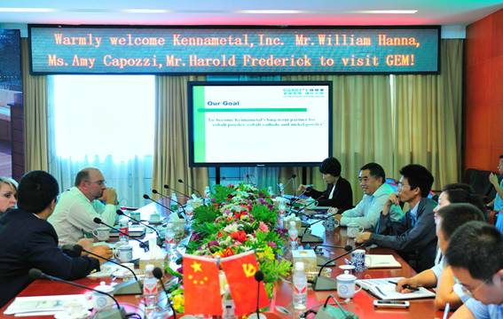 ????? 2012年9月12日,美国肯纳金属公司Mr. William Hanna, Ms. Amy Capozzi,Mr. Harold Frederick莅临荆门格林美城市矿产资源循环产业园进行考察调研,格林美董事长许开华、常务副总王敏陪同客人考察了荆门格林美分析检测中心、电子废弃物车间、钴粉生产车间、特种钴粉制造车间、研发中心、稀贵金属车间以及德威格林美。参观完毕后双方进行了座谈交流。