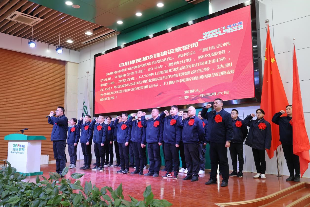 2021年3月6日下午17时,伴随着海外将士们铿锵嘹亮的誓言,格林美集团印尼镍资源项目团队出征海外欢送仪式在荆门园区国际会议厅隆重举行。集团党委书记、董事长许开华教授,集团董事王敏女士,集团副总经理吴光源,集团副总经理张坤博士,集团总会计师陈斌章等集团高管,印尼镍资源项目部全体人员以及出海员工家属代表等出席,荆门园区各事业部、各部门负责人参加仪式。
