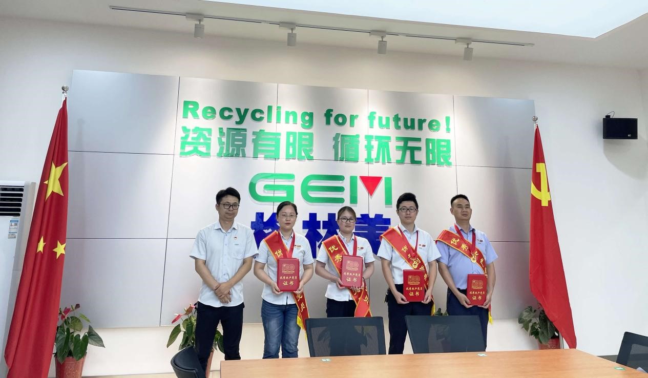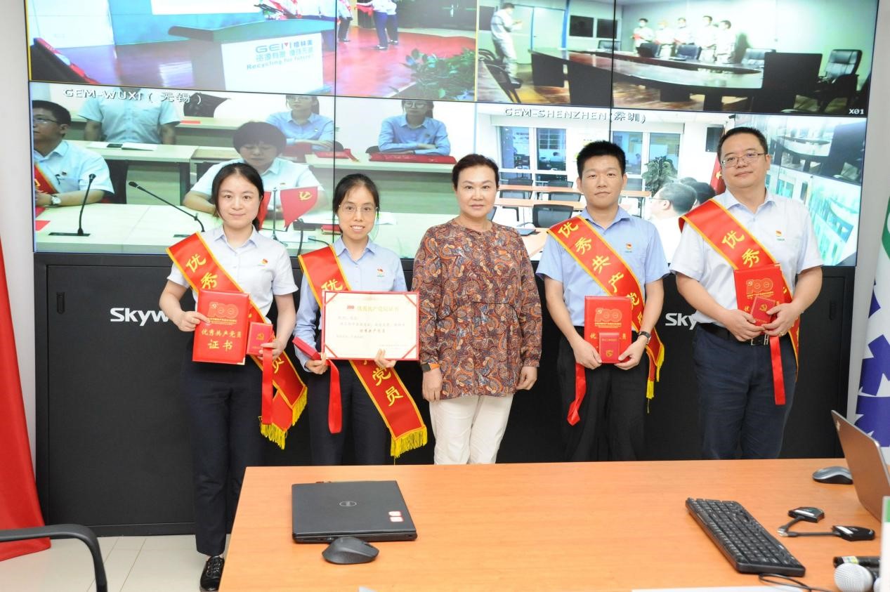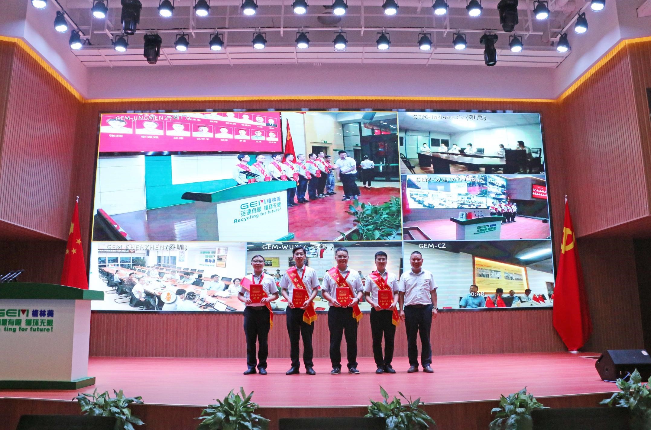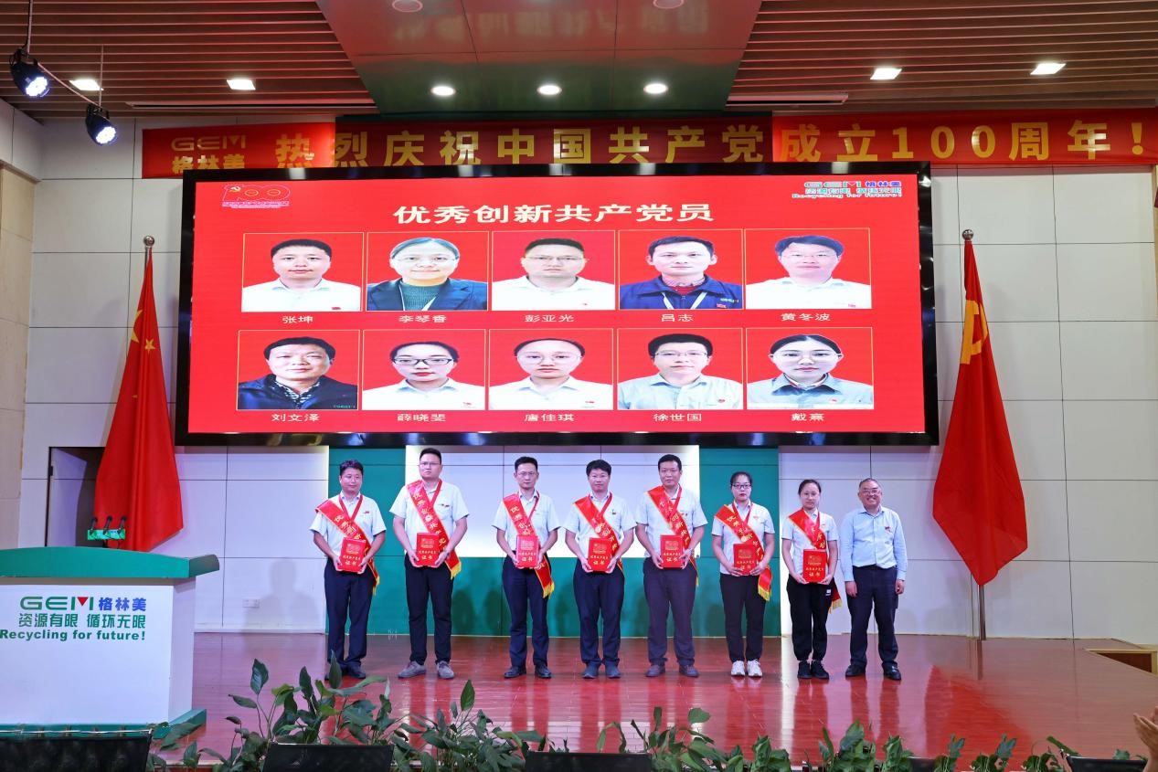 集团党委副书记王敏同志在大会上宣读了“格林美集团党委关于表彰建党100周年优秀组织与先进个人的决定”,大会授予欧阳铭志等50名同志“优秀共产党员”称号,授予张坤等10名同志“优秀创新共产党员”称号,授予宋华周等10名同志“优秀工匠共产党员”称号,授予娄会友等10名同志“优秀党务工作者”称号,授予荆门园区机关党支部等5个党支部“优秀党支部”称号。大会为受表彰的组织及个人颁发荣誉证书与纪念奖章。
