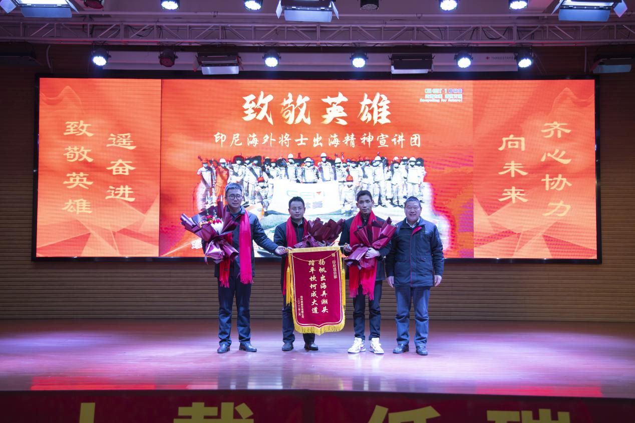2月17日下午18:00,在海外将士归国宣讲团首次宣讲会上,集团副总经理鲁习金为印尼镍资源项目副总经理刘环宇、实验技术副总监许鹏云、项目部经理周洪等印尼镍资源项目归国英雄们授予锦旗,感谢海外英雄们的无私奉献。