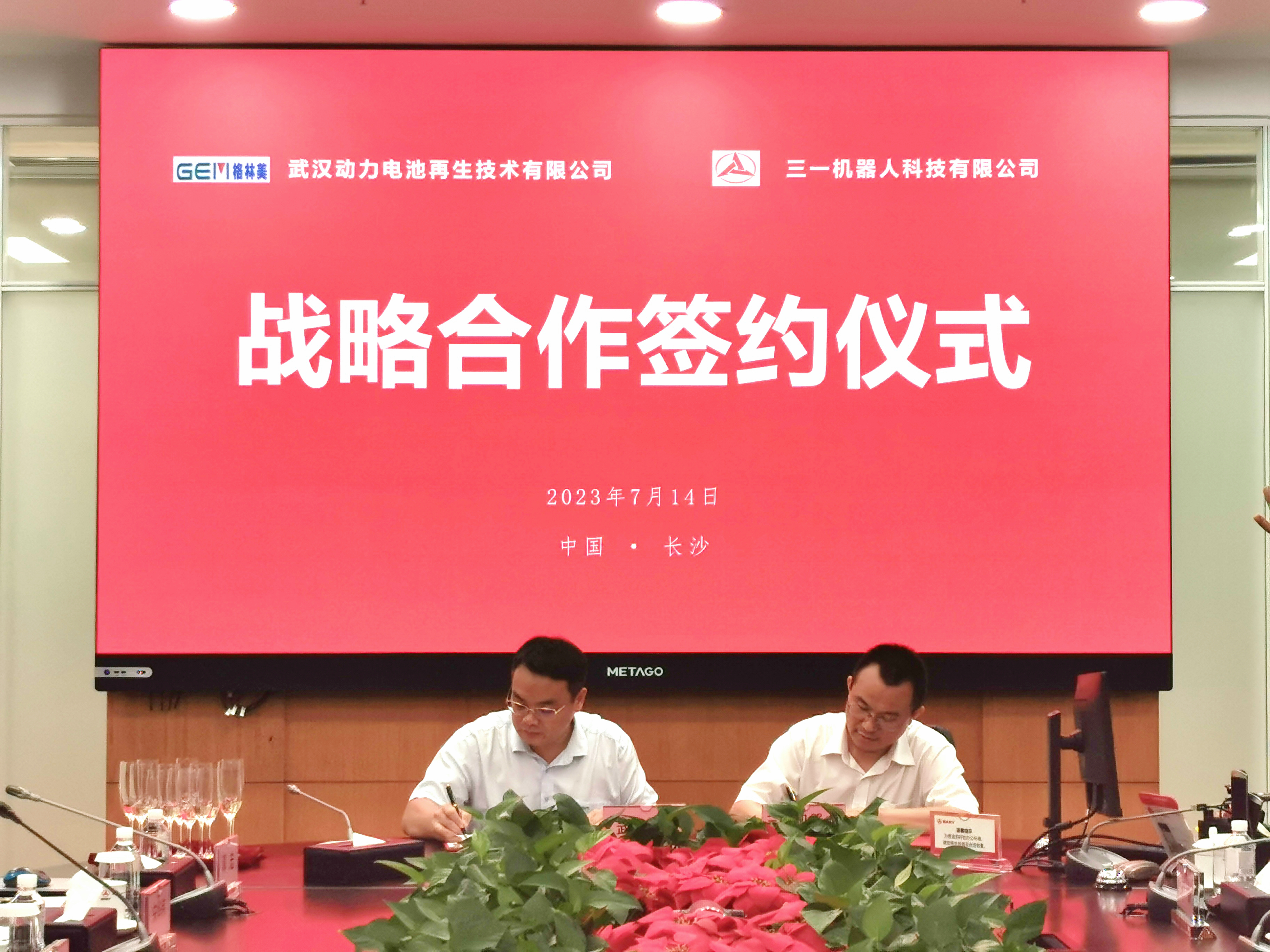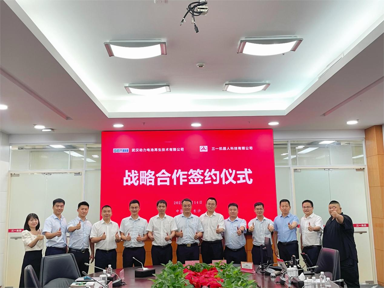 2023年7月14日,武汉动力电池再生技术有限公司(以下简称“武汉动力再生”)与三一机器人科技有限公司(以下简称“三一机器人”)在湖南长沙正式签署战略合作协议,格林美集团副总经理、武汉动力再生董事长、总经理张宇平博士与三一集团副总经理、三一机器人董事长郭承志先生代表双方签约。双方将以各自集团为依托、以技术创新为引领,在AGV、AMR等智能工业装备领域优势互补、长期合作,以低碳先锋为引领,共创绿色循环生活。