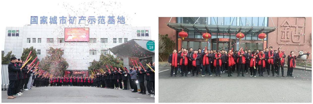 上午8时48分,各园区举行开工仪式,鞭炮齐鸣、礼花冲天,恭贺开工大吉、龙行大运,在喜庆和欢腾的气氛中,奋发向上的格林美人以崭新的精神面貌迎接2024年,吹响新春“龙腾虎跃”的号角。