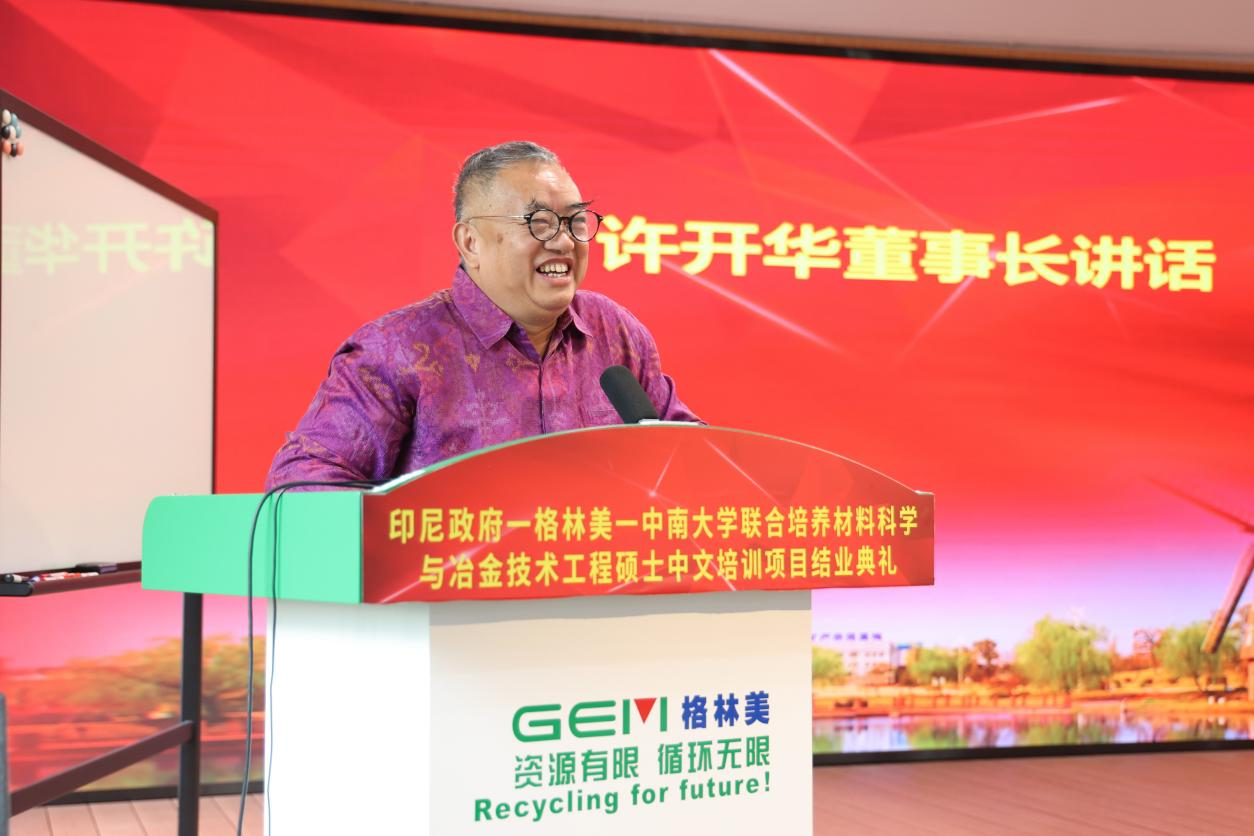 此外,许开华董事长还分享了自己荣获印尼政府对中国人颁发的第一张黄金签证的喜讯。他强调,这一荣誉的取得离不开格林美在推动中印尼联合培养冶金硕士国际班方面所取得的重大成效。这一项目的成功实施,在印尼引起了广泛关注与赞誉,标志着中印尼科技文化融合与交流的巨大成功。展望未来,格林美将继续肩负起更大的责任与使命,将中印尼联合培养硕士国际班从“1”推向“1+N”的培养模式,并实现由新能源材料与冶金工程技术专业招生扩展到交通运输、生物医药、有色金属国际贸易等四个专业招生,全面为2045黄金印尼的经济社会发展提供强大的人才支撑。