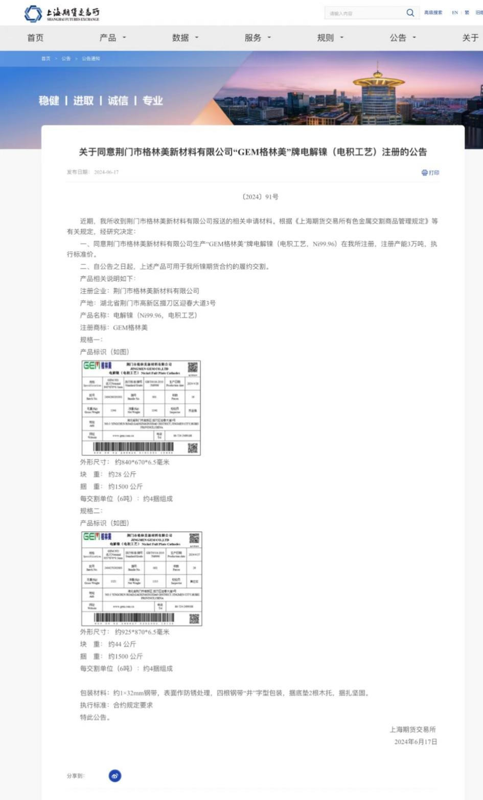 “GEM格林美”牌电解镍(电积工艺,Ni99.96)在上海期货交易所成功注册