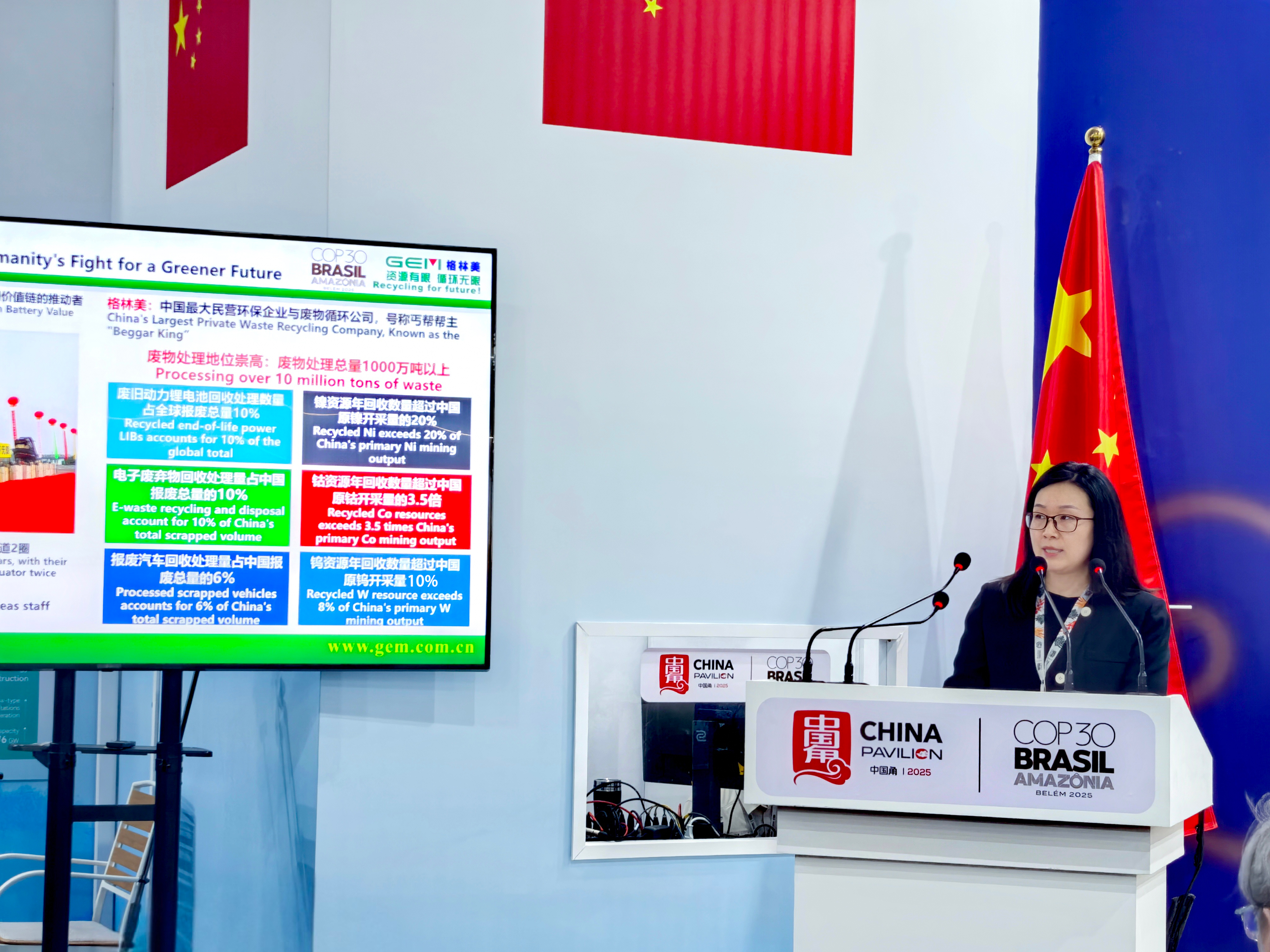 ▲格林美集团ESG管理部总监徐晓宇在COP30中国角发表主旨演讲