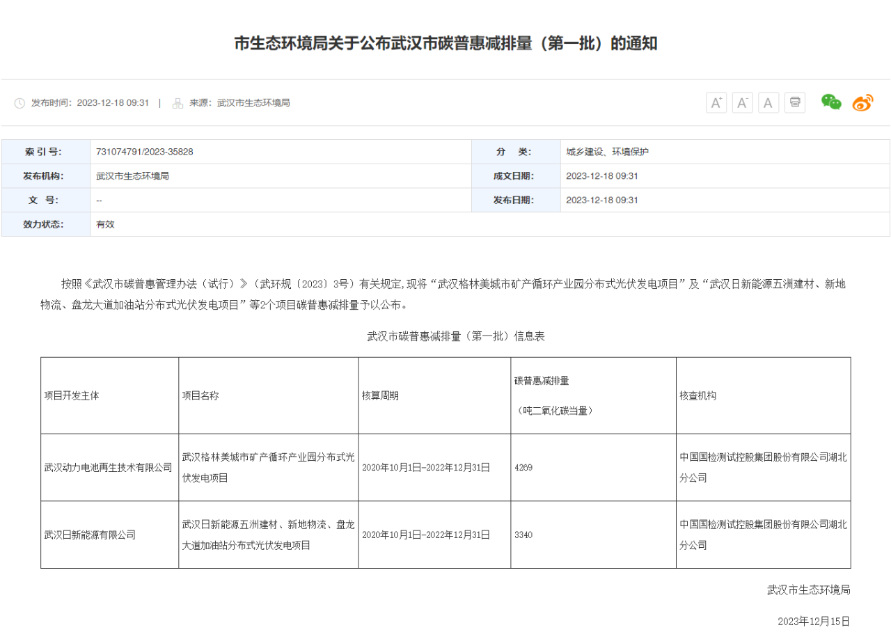 2023年12月18日,武汉碳普惠登记平台登记了经武汉市生态环境局发布的首批(仅有2家单位)碳普惠减排量项目,共计减排7609吨,其中格林美集团申报的“武汉格林美城市矿产循环产业园分布式光伏发电项目”获批签发登记碳普惠...