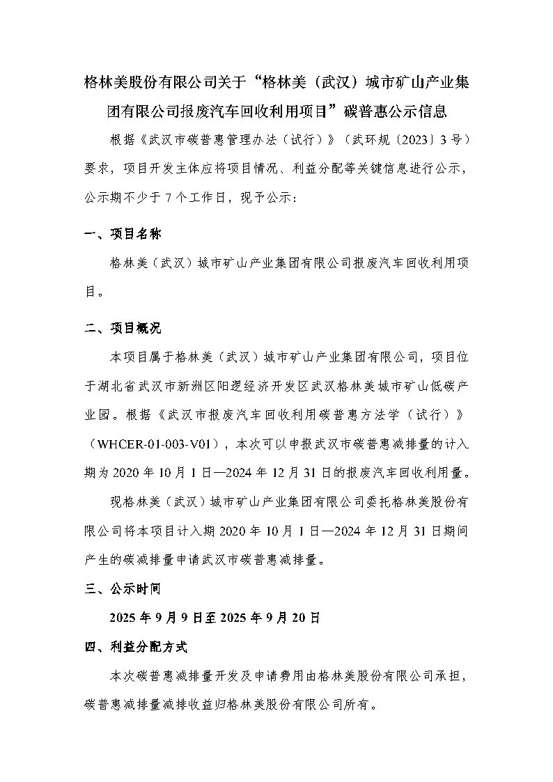 • 格林美股份有限公司关于“格林美(武汉)城市矿山产业集团有限公司报废汽车回收利用项目”碳普惠公示信息