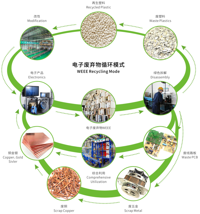 每年可处理报废线路板2万吨以上,金银等贵金属回收处理能力10吨以上,循环再生废塑料产能10万吨/年以上。