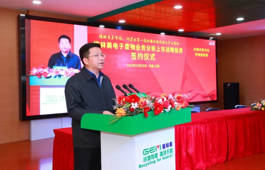 签约仪式上,李晓楚发表了热情洋溢的致辞。他说,格林美公司与丰城市政府及格林美战略投资者合作签约仪式的举行,标志着格林美集团在丰城的二次创业,江西格林美启动分拆上市、建设世界级循环经济产业园的战略部署拉开帷幕。格林美作为全国循环经济领军企业,被誉为中国城市矿山第一股,十年来,公司在丰城从租用小厂房,发展到现在的四个厂区,成为集团的重要生产基地。在格林美等一批龙头企业的带动下,丰城循环经济也由小到大,预计到2023年可望实现年产值超千亿元。丰城循环经济园区也正在成为中东部地区发展再生资源最具投资价值和发展潜力的首选地。