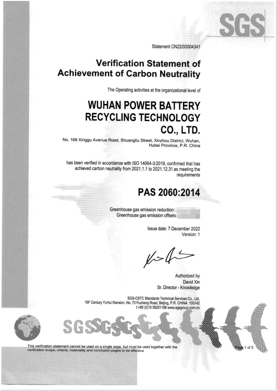 日前,格林美打造的零碳示范园区——武汉动力电池再生技术有限公司(以下简称“武汉动力再生”)正式通过通标标准技术服务有限公司(以下简称“SGS”)碳中和认证,获颁碳中和证书。多年来,武汉动力再生通过近零碳排放园区试点建设部署,积极打造低碳示范场景,大大降低了温室气体排放,园区实现碳中和。
