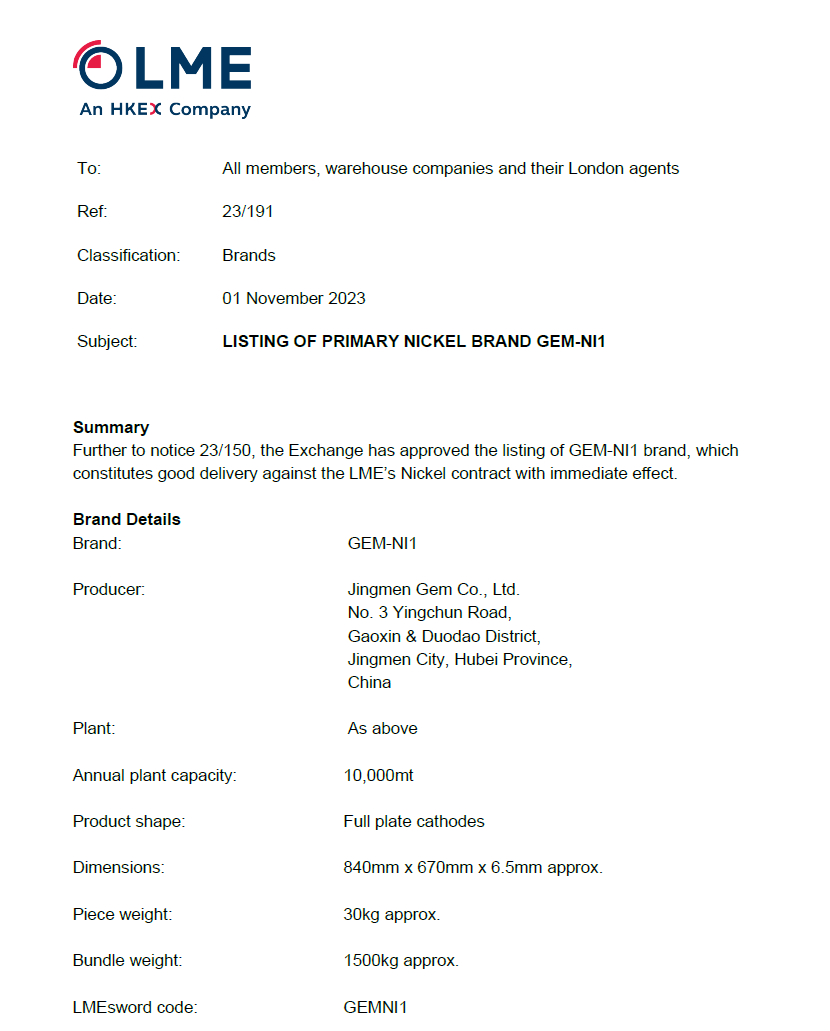 2023年11月1日,‘GEM-NI1' 牌电解镍成功注册伦敦金属交易所交割品牌,JINGMEN GEM CO., LTD 成为LME镍品牌注册快速通道推出后的第二家受益的公司。