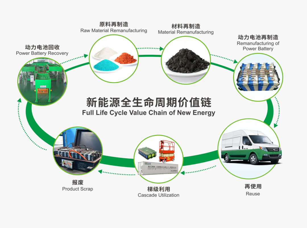 不仅仅是钴这一种金属材料在格林美实现了循环利用,目前,格林美集团下属子公司武汉动力电池再生技术有限公司(以下简称“动力再生”)已打造出“电池回收-原料再造-材料再造-电池包再造-再使用-梯级利用”全生命周期价值链体系,实现废旧电池变废为宝、循环利用。