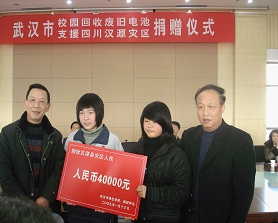 2008年12月,武汉23所高校全面开展回收废旧电池、爱心捐赠支援灾区的活动。高校回收的废旧电池按照每节0.1元兑换金额,全部捐赠给四川灾区学校学生。