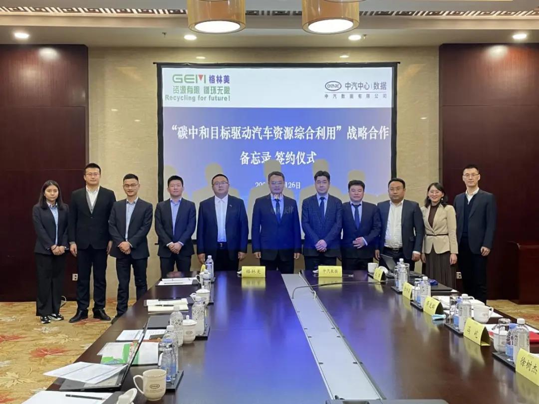 2021年10月26日,格林美与中汽数据有限公司(以下简称“中汽数据”)在天津签署“碳中和目标驱动汽车资源综合利用”战略合作备忘录。中汽数据总经理冯屹、中汽数据生态业务部部长徐树杰、格林美集团副总经理张宇平、格林美天津园区总经理张振中等出席活动。