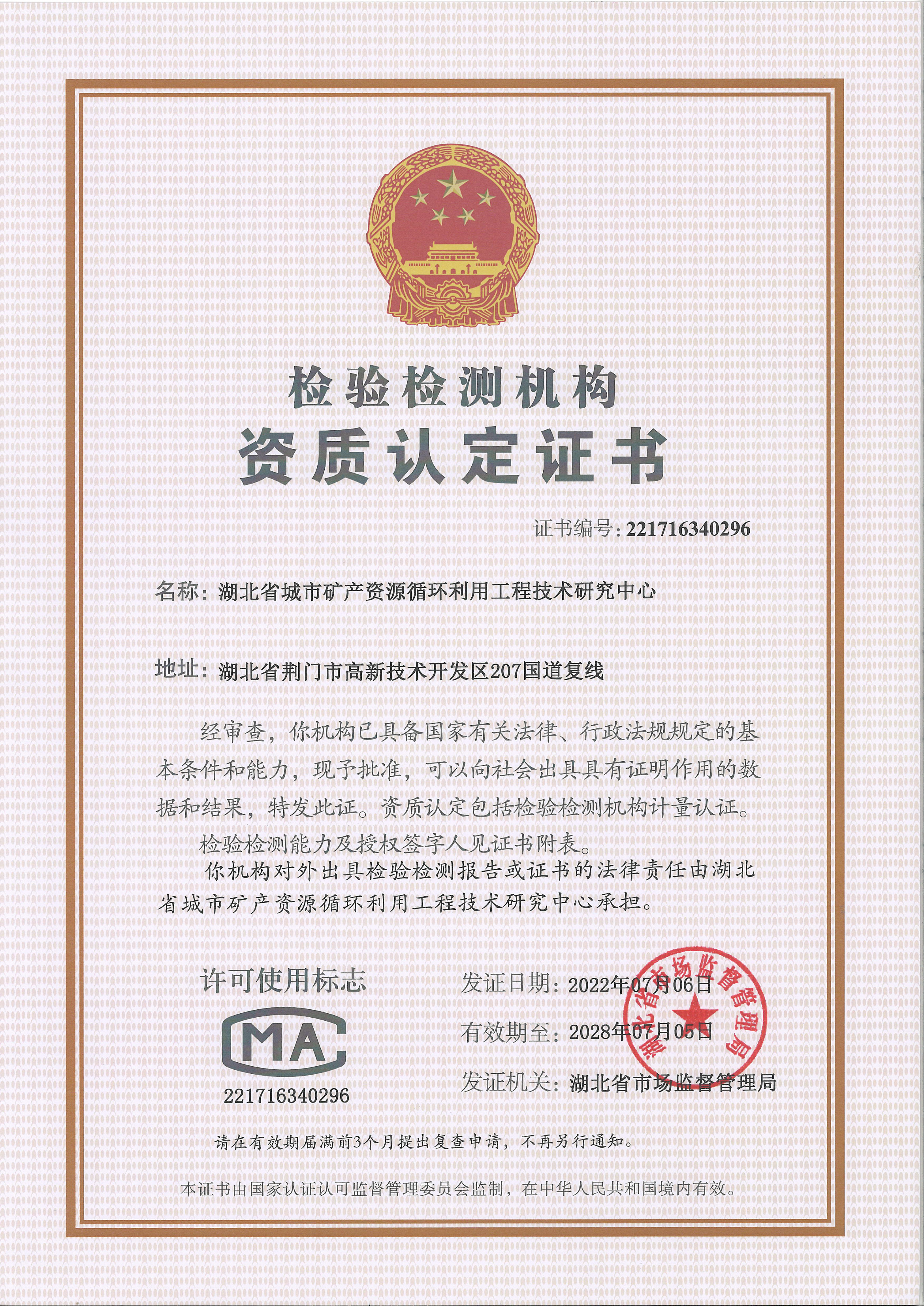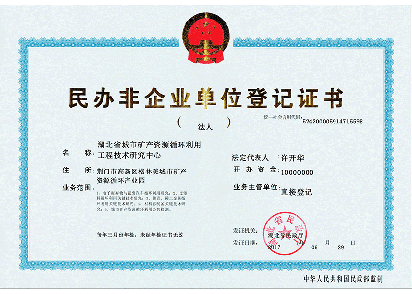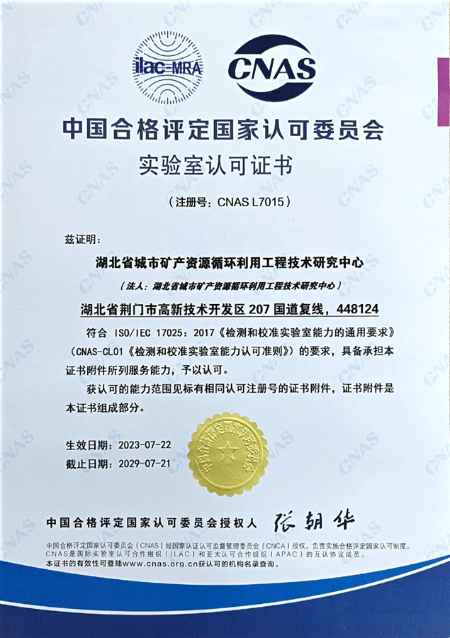国家电子废弃物循环利用工程技术研究中心分析检验中心(以下简称“中心”)成立于2005年,前身是荆门市格林美新材料有限公司检测中心,主要业务是监控公司所有化学物料的质量、环境及废物回收利用等相关检测工作,随着检测能力与知名度的增加,2012年,中心升格为“湖北省城市矿产资源循环利用工程技术研究中心”,于2013年开始独立运行,并取得国家认可委颁发的CNAS证书,省质量监督局颁发的CMA证书,2016年获湖北服务行业名牌证书,主导、参与制定国家、行业标准30项,以服务社会为宗旨,对外提供检测业务,业务服务范围包括:电子废弃物的循环利用研究检测、稀贵、稀土金属循环利用关键技术研究检测、固体废弃物循环利用检测、新型电池材料检测等。