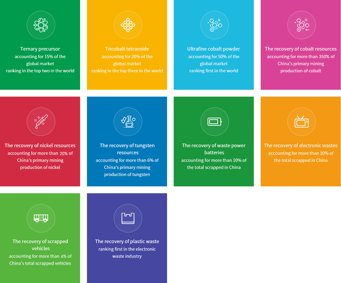 GEM has built 16 waste recycling treatment plants and new energy material manufacturing plants in 11 provinces and cities in China, as well as in South Africa, South Korea, Indonesia and other places, and built an urban mine recovery and mining system centered on major cities in China. The footprint of green development radiates the world, covering more than 40% of China's land area, establishing waste treatment cooperation relationships with more than 500 million people, recycling more than 30 kinds of scarce resources such as cobalt, nickel, lithium, copper, tungsten, gold, silver, platinum, palladium, rhodium, gallium, germanium, indium, and rare earth. The annual recycling of retired power batteries and electronic waste accounts for more than 10% of China's total, the annual recycling of scrapped cars accounts for more than 6% of China's total scrap, and the annual recycling of nickel resources accounts for More than 20% of China's original nickel mining output, and more than 350% of China's original cobalt mining output are recycled cobalt resources, The recovered tungsten resources account for more than 6% of China's original tungsten mining output.